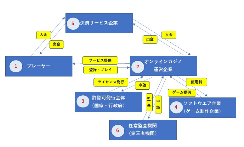オンラインカジノにおけるライセンス制度を詳しく見ていく前に、オンラインカジノ事業の仕組みを全体図で。
