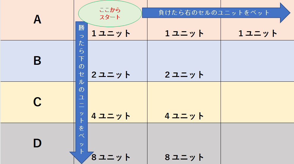 その別名の名の通り、ベットするユニットとその順番を表していて、これもまたシンプルな手法ですが、損失リスクをそれなりに抑えつつ利益を出していけます。ローリスクミドルリターンと言ったところでしょうか。